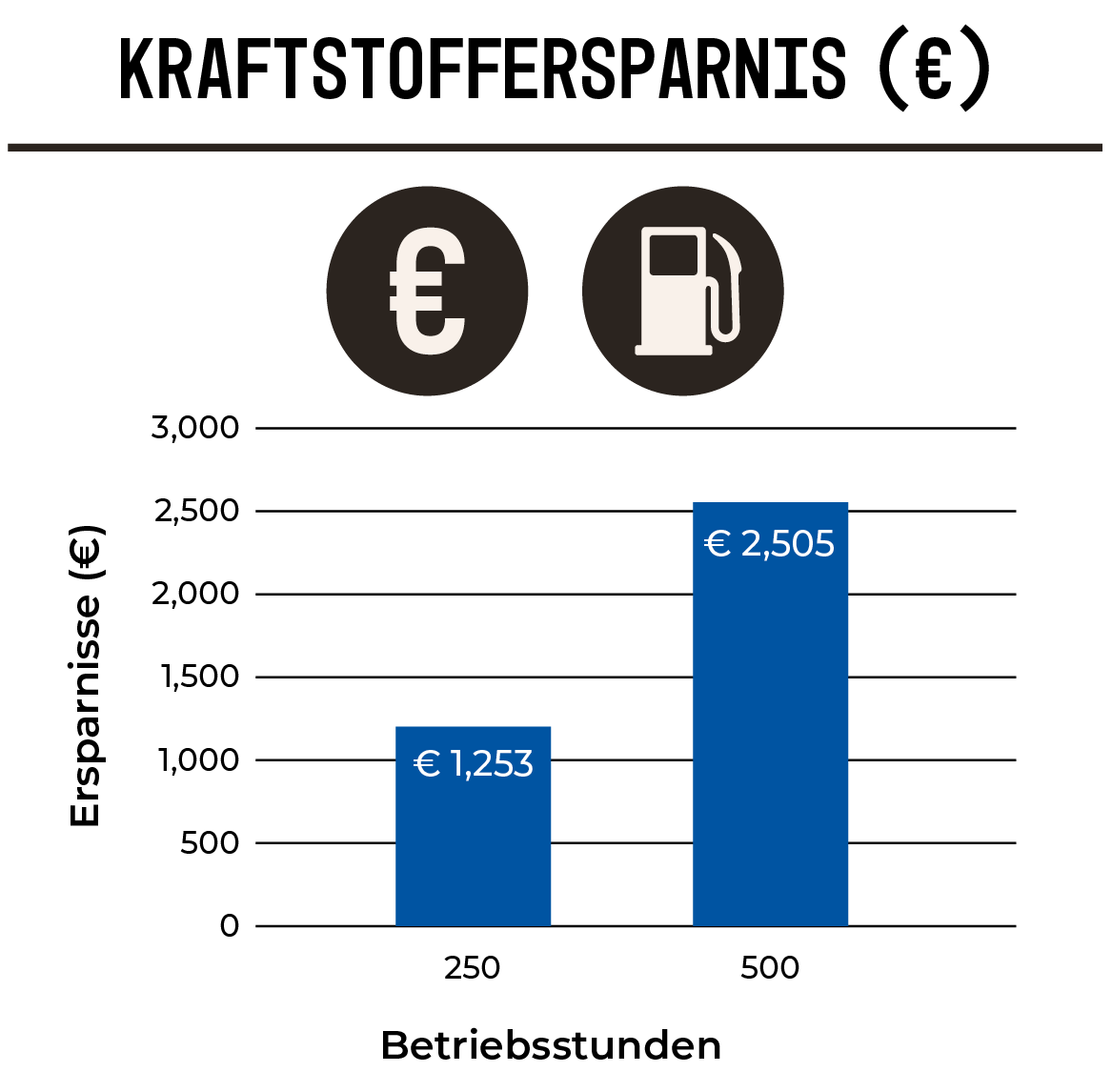 Nach von der DLG im Feld durchgeführten Tests, 3 L/S Kraftstoffeinsparung im Vergleich zu VF-Wettbewerbsreifen. Angenommen: Dieselpreis 1,67 €/Liter.
