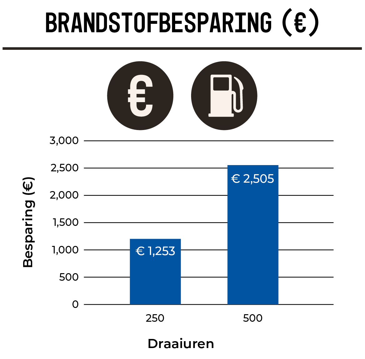 Volgens tests die DLG in het veld heeft uitgevoerd, een brandstof- besparing van 3 L/U in vergelijking met een VF-band van de concurrent. Aanname: dieselprijs 1,67 €/liter.