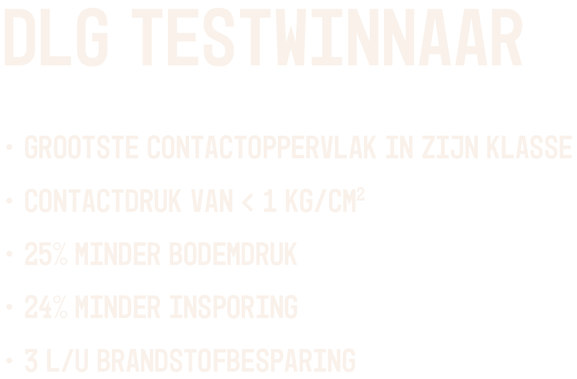 Volgens tests uitgevoerd door DLG in het veld, vergeleken met een concurrent VF-band. Geteste banden VF 750/60 R 30.5 met 7.100 kg belasting en bandenspanning aangepast voor maximaal 10 km/u veldwerk (1.0 bar).